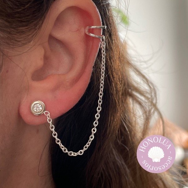 Arito pasante con brillo y cadenita que lo une a un ear cuff (aro a presión para la zona del cartílago)