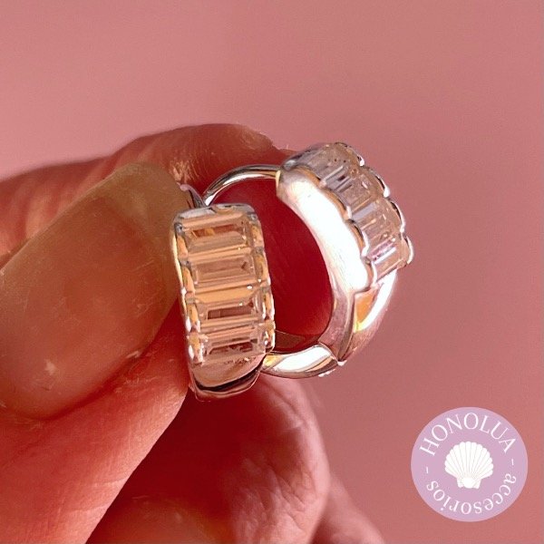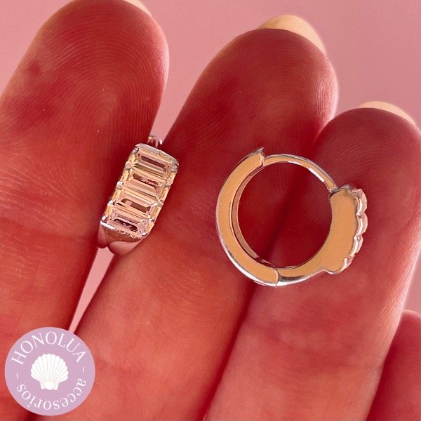 Argollitas con cierre click. Con brillantes estilo Baguette, super finos y delicados. Tienen 14 mm de diámetro.