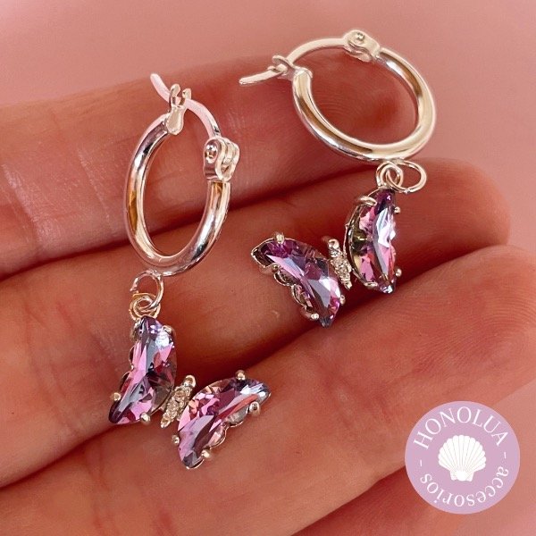 Argollitas de 15 mm de diámetro con dije de mariposa tornasolado.